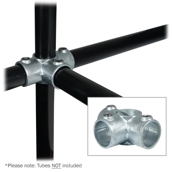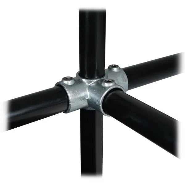 Key clamps are designed to secure and connect 48.3mmØ tubes quickly and easily. The wide range of options available enables users to create a huge variety of configurations including lighting grids, studio frames, staging and exhibitions stands. The side outlet key clamp allows for the connection of four tubes, with one tube passing directly through the central junction, more commonly used to connect uprights with horizontal tubes at 90° to the upright in 3 directions.