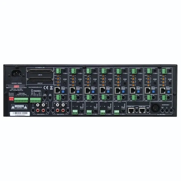 - Each zone output features front panel operator controls for source select, priority mic override, paging mic level, music level and master volume control