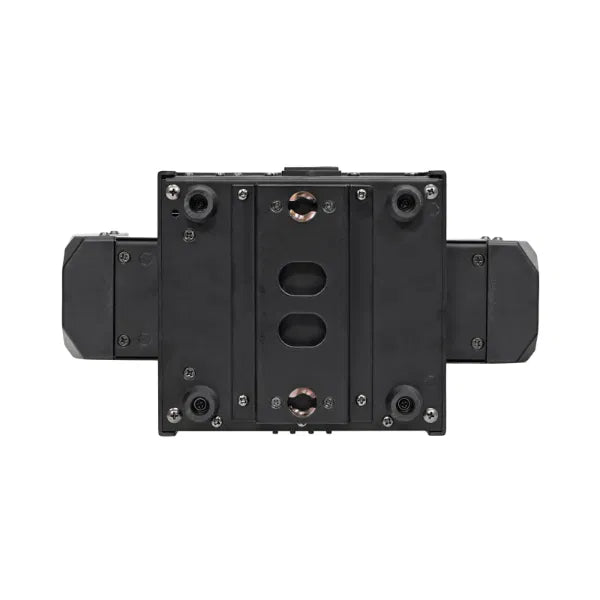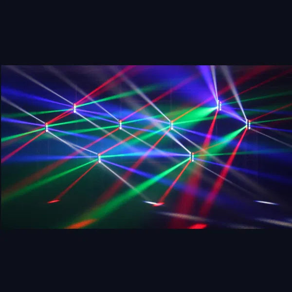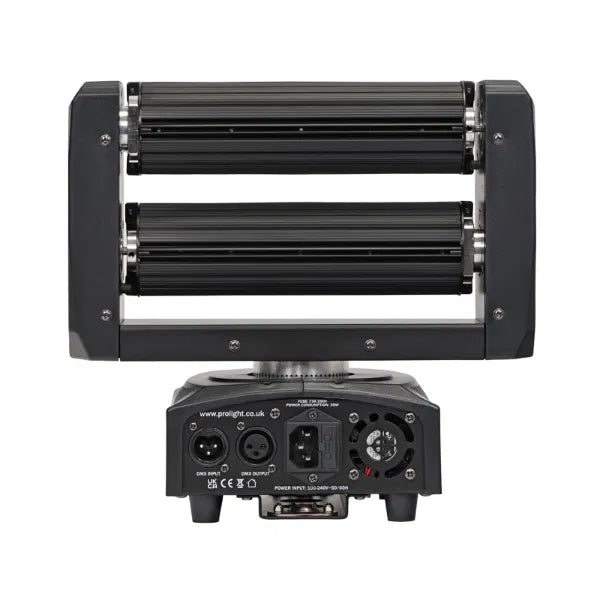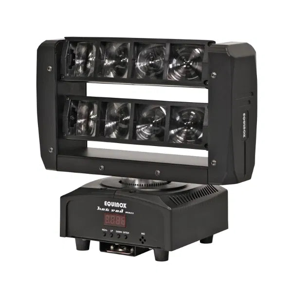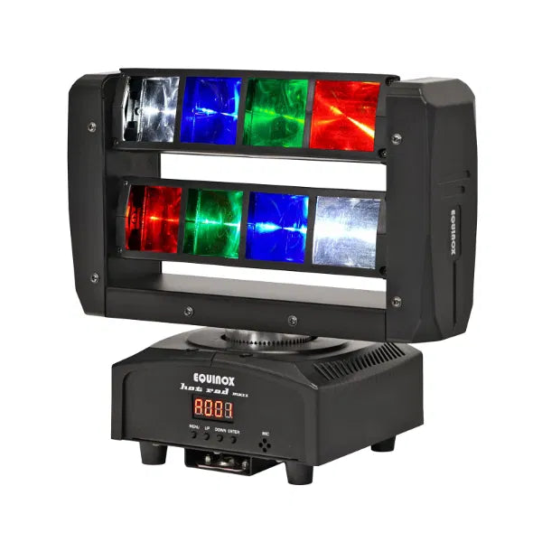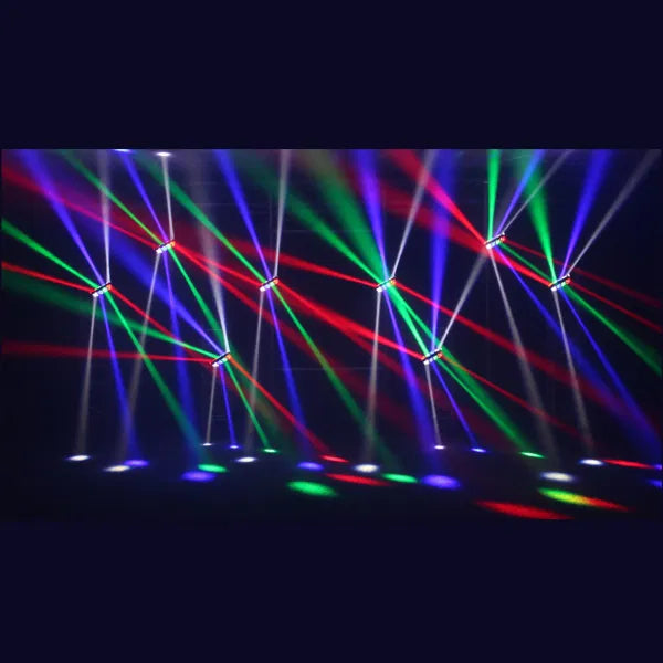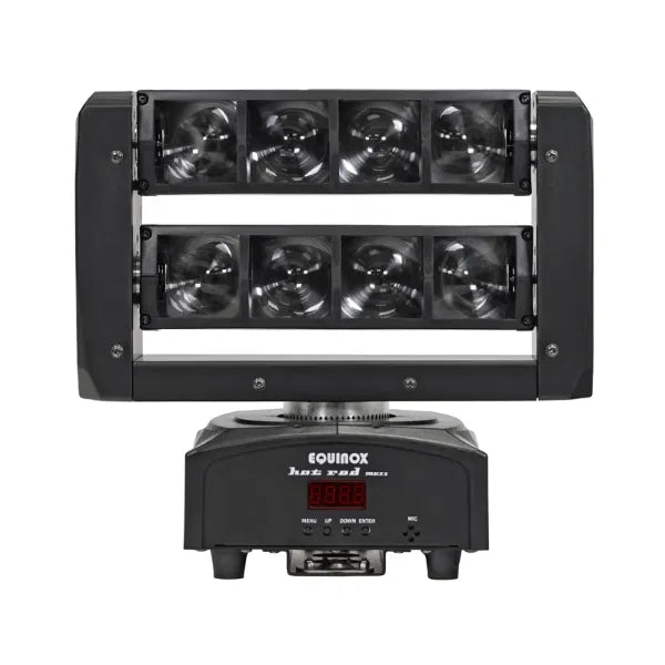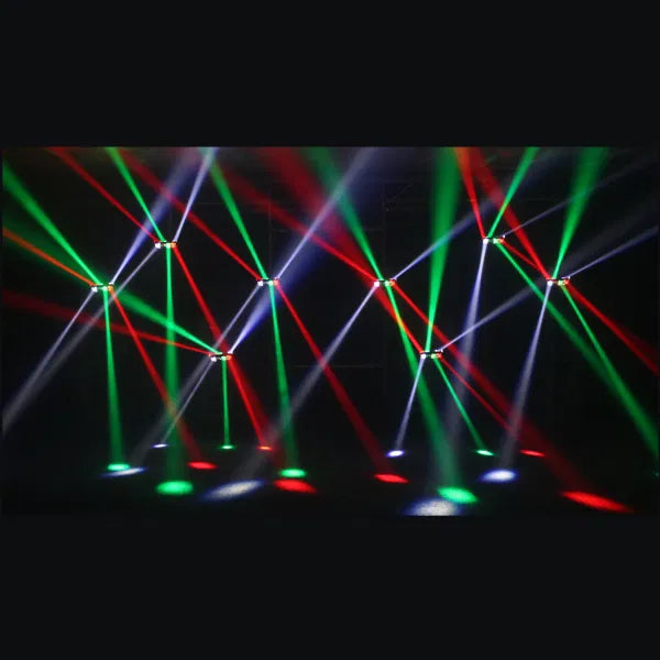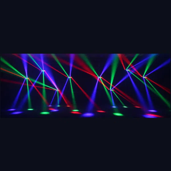Fast moving 3.4° beams are projected from the twin, individually controllable, tilting bars which create dynamic atmospheric effects. Smooth, fast motors for pan and independent tilt movements allow the fixture to generate stunning mid-air effects from its 8 zones which are ideal for mobile DJs and clubs. On-board modes include: DMX, stand alone, sound active and master/slave.